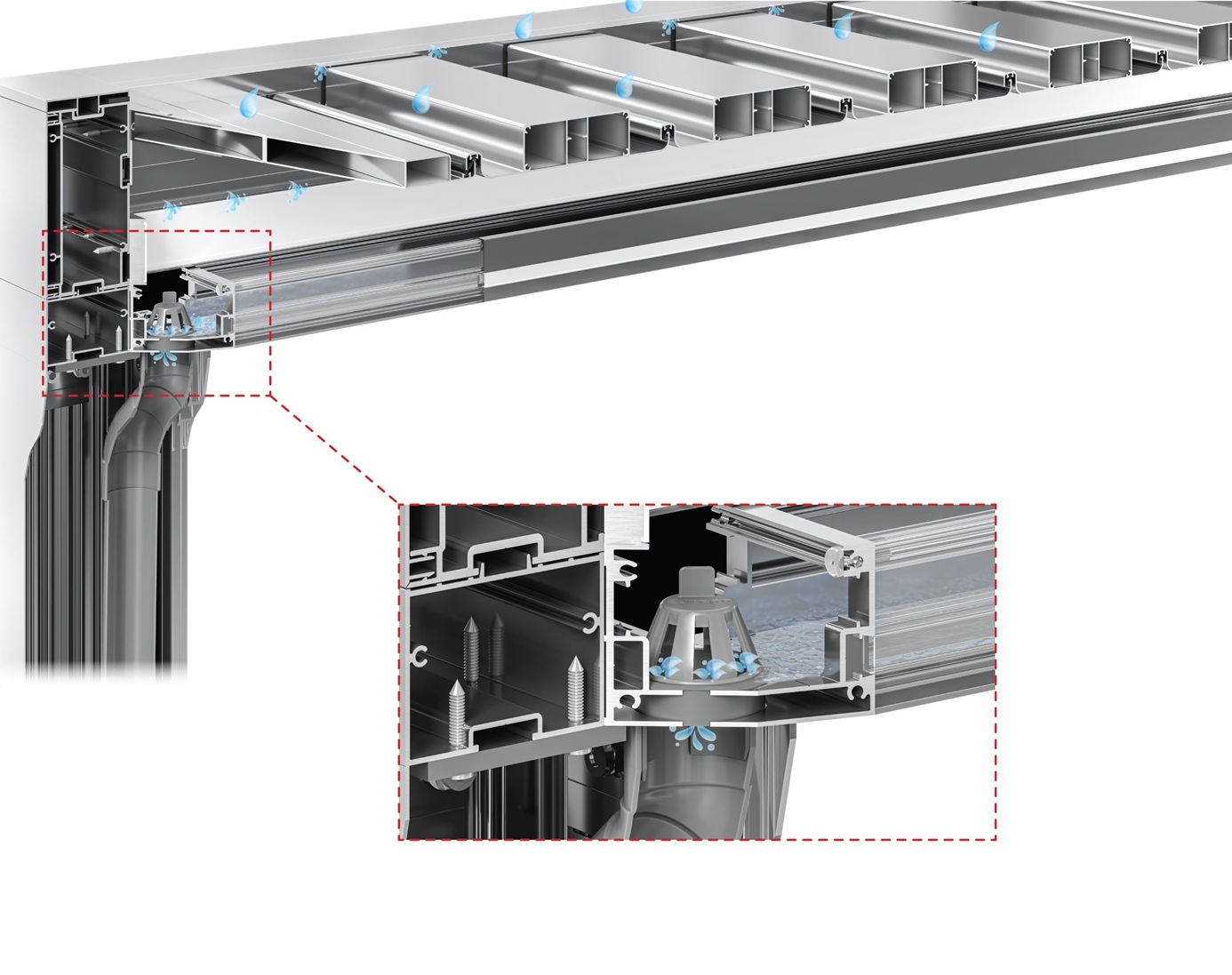 Ο έξυπνος σχεδιασμός των πτερυγίων, σε συνδυασμό με τον ειδικό περιμετρικό συλλέκτη υδάτων στις οριζόντιες δοκούς, επιτρέπει την απορροή των νερών στο εσωτερικό των κάθετων κολωνών και την ασφαλή εκροή τους στη βάση του συστήματος, χωρίς διαρροές στην καλυπτόμενη επιφάνεια.