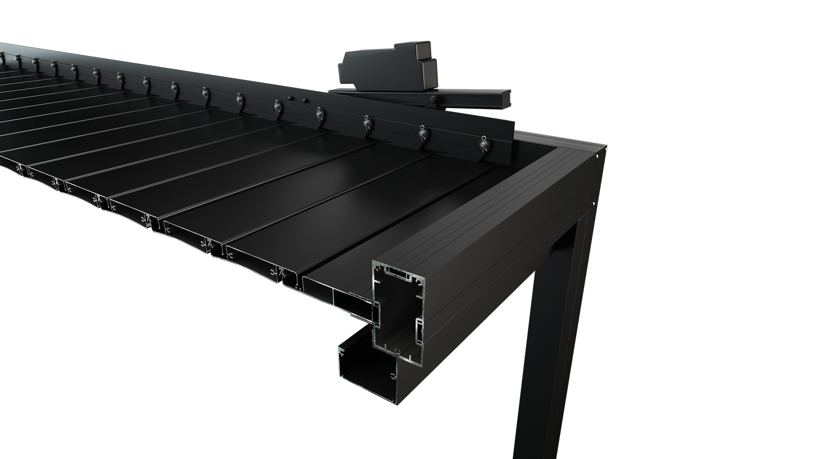 Η πέργκολα διαθέτει υποδομή για κρυφή κάθετη ηλεκτρική σήτα ή πανί σκίασης και μπορεί να τοποθετηθεί είτε ελεύθερα είτε σε επαφή με την τοιχοποιία, προσφέροντας πλήρη ελευθερία σχεδιασμού.