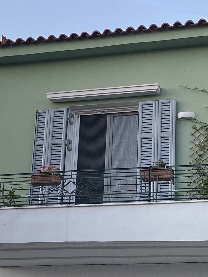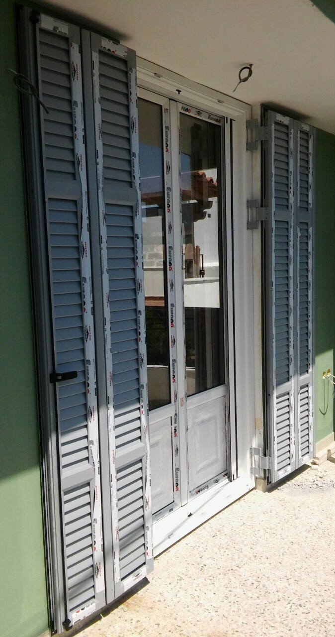 Οι ιδιοκτήτες επέλεξαν κουφώματα Europa σε χρώμα Ral 7040, Τετράφυλλα, σπαστά, παραδοσιακά παντζούρια & Ral 9010 Λευκό για τα Εσωτερικά Τζαμιλίκια.