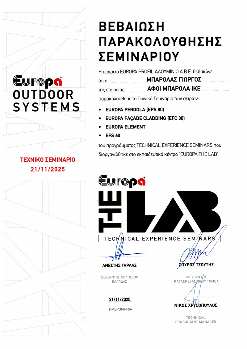 Η Europa Profil Αλουμίνιο Α.Β.Ε., παραγωγός των κορυφαίων συστημάτων αλουμινίου Europa, πραγματοποίησε ενδελεχή αξιολόγηση των εγκαταστάσεων και των τεχνικών μας μεθόδων. Με βάση αυτή την αξιολόγηση, επιβεβαίωσε ότι η εταιρεία μας συμμορφώνεται πλήρως με τις κατασκευαστικές προδιαγραφές των συστημάτων Europa, απονέμοντάς μας το σχετικό Πιστοποιητικό Συμμόρφωσης Κατασκευαστή.