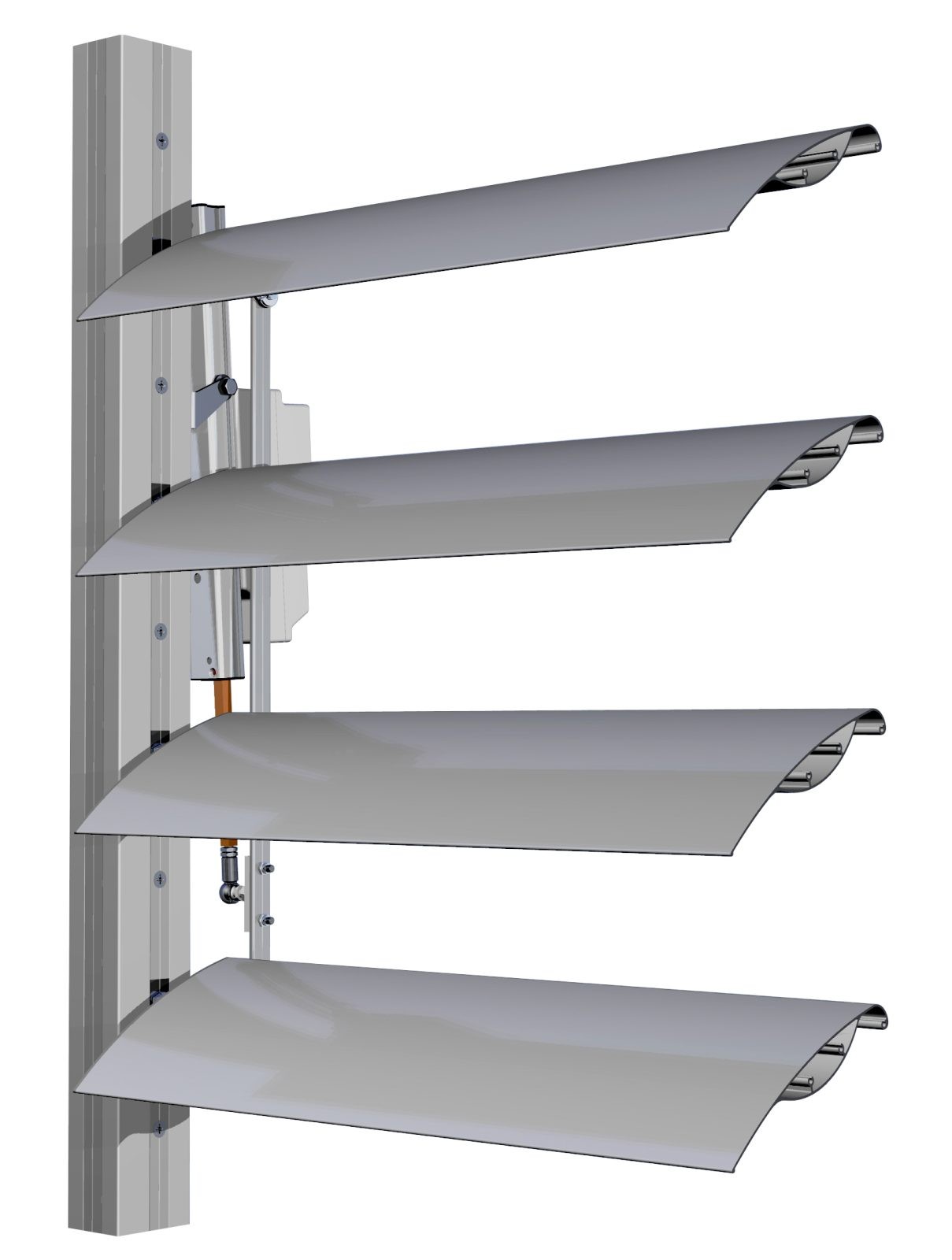 Διαθέτει τέσσερα διαφορετικά πτερύγια με μοναδικό σχεδιασμό, τα οποία συμβάλλουν στην αποφυγή υπερθέρμανσης των εσωτερικών χώρων, στην προστασία από την ηλιακή ακτινοβολία και στην ασφάλεια των γυάλινων επιφανειών του κτιρίου από θραύση. Κάθε πτερύγιο μπορεί να είναι σταθερό ή να διαθέτει ρύθμιση κλίσης, προσφέροντας ευελιξία και έλεγχο ανάλογα με τις ανάγκες.